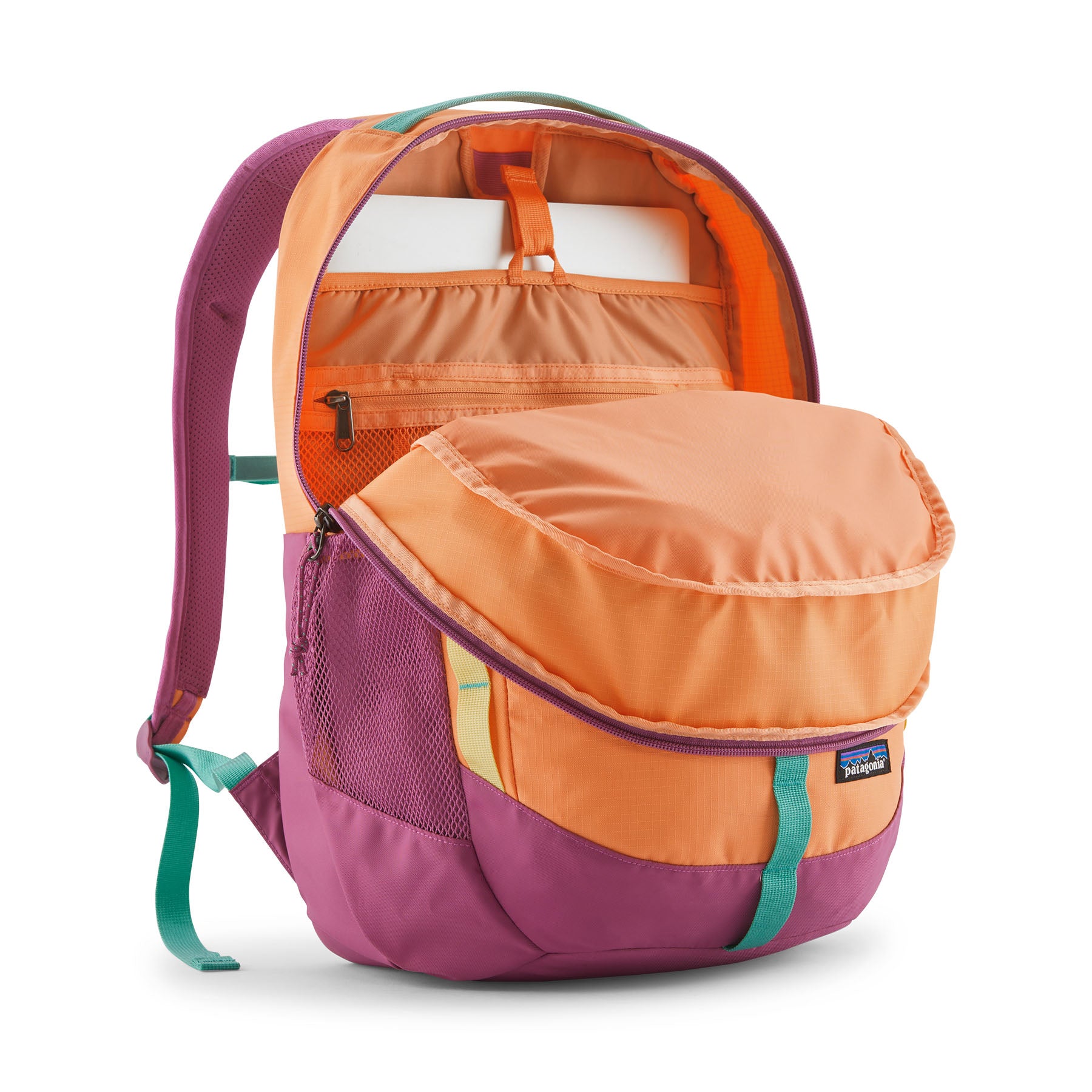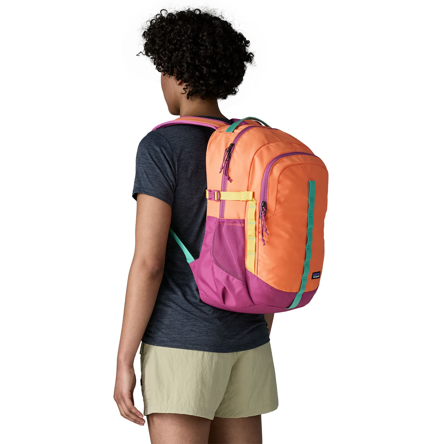 Body and/or contrast (select colourways): 2-layer, 7.3-oz 400-denier 100% postconsumer recycled polyester plain weave ripstop with a PU coating and a durable water repellent (DWR) finish made without intentionally added PFAS. Body and/or contrast (select colourways): 7.4-oz 400-denier 100% recycled polyester ripstop with a PU coating and a DWR finish made without intentionally added PFAS. Lining: 3-oz 200-denier 100% recycled polyester plain weave with a PU coating. Back panel and shoulder straps: 8-oz 100% recycled polyester airmesh. Side pockets: 7.1-oz 72% recycled nylon/28% spandex power mesh. Webbing: 100% recycled nylon. Body, back panel/shoulder strap and pocket fabrics are certified as bluesign® approved. Made in a Fair Trade Certified™ factory