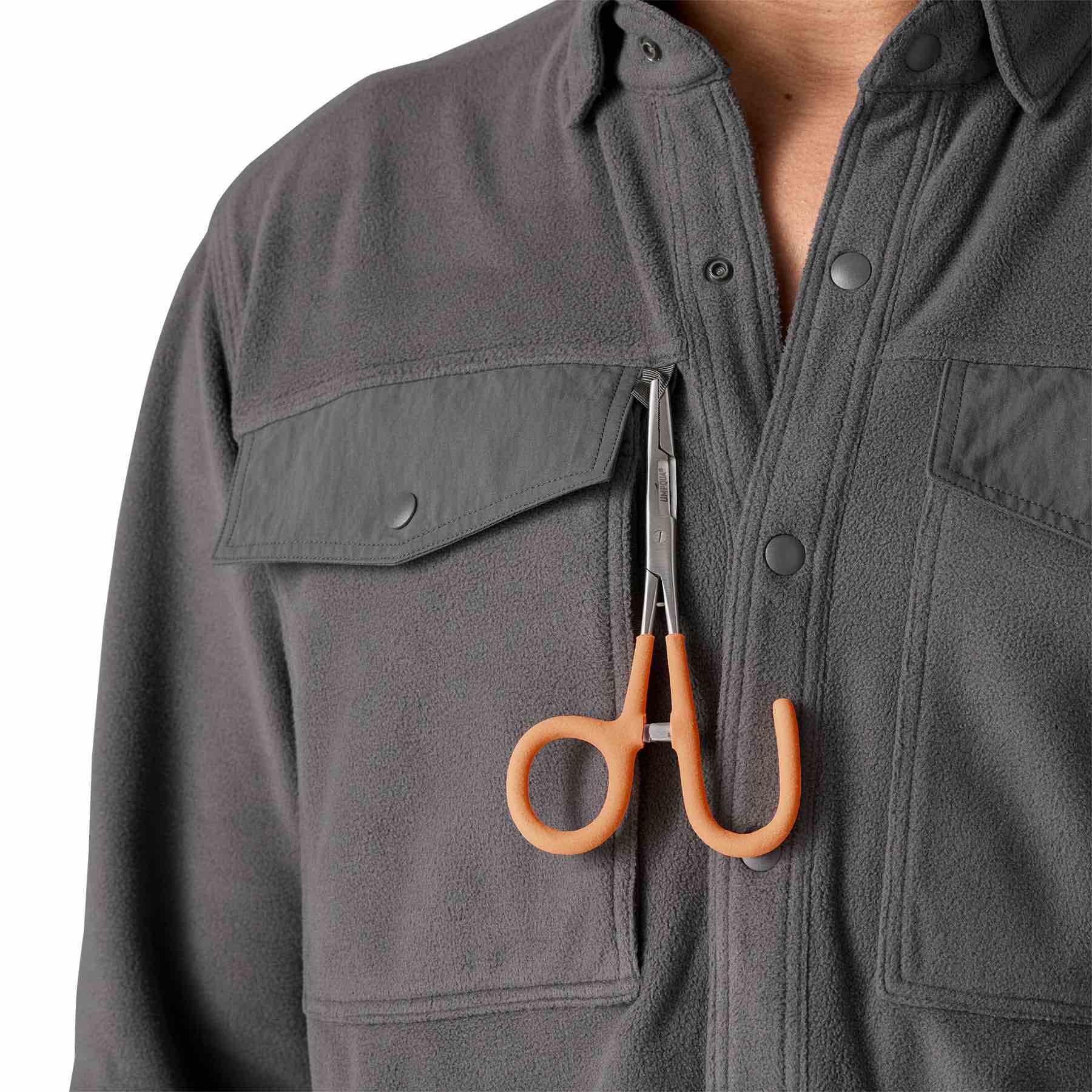 - Two snap-closure chest pockets for fly boxes; right-chest pocket has an internal vertical-zip pocket for security; pocket flaps are 100% recycled nylon