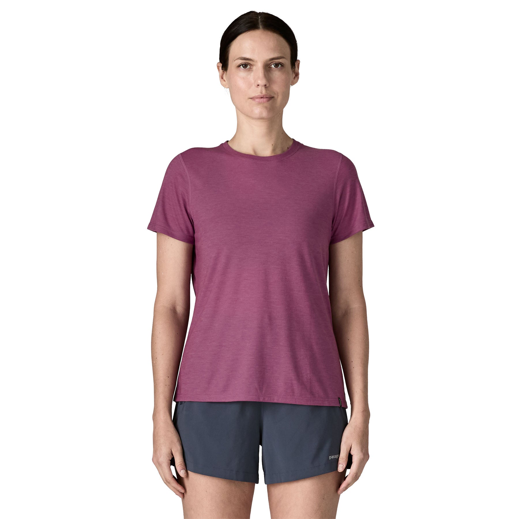 - Small Patagonia woven label at the left-front hem
